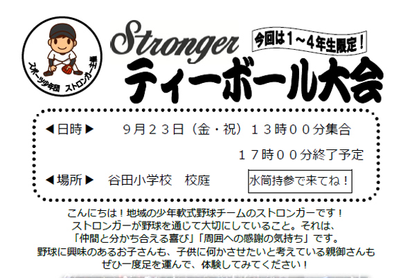 ●お申し込みはこちらから● こんにちは。ストロンガーです。来る9月23日にTボール大会を開催いたします!Tボールは、柔らかいボールをTスタンドと呼ばれるものに置いて、プラスチックのバットで打つ野球で …